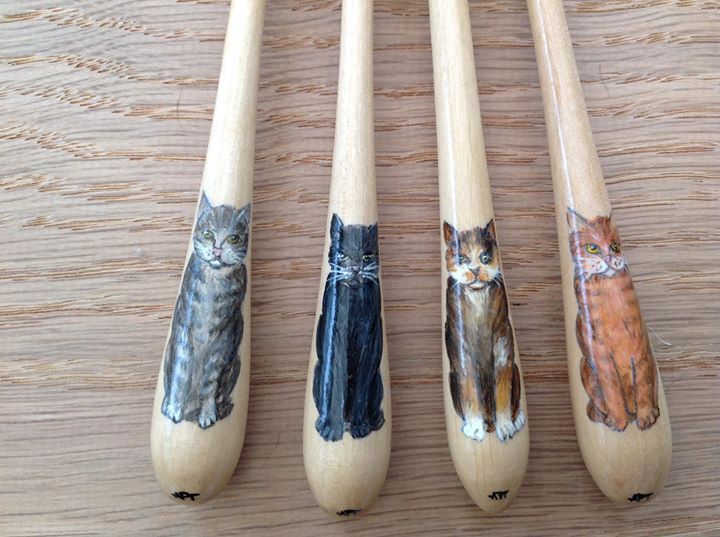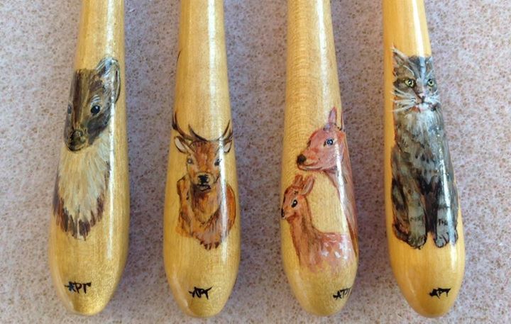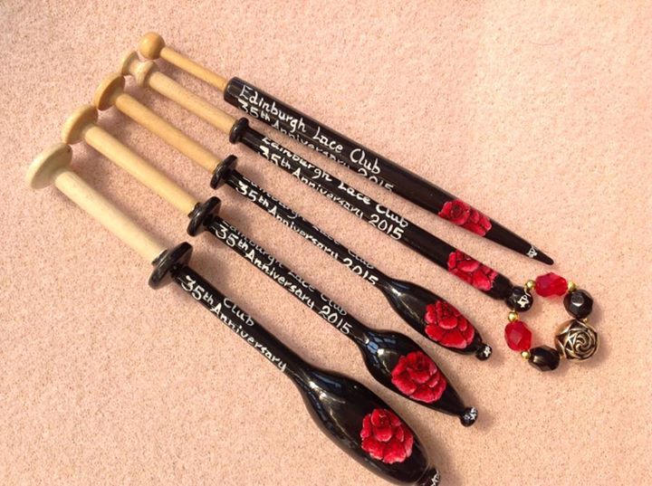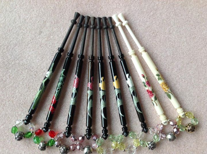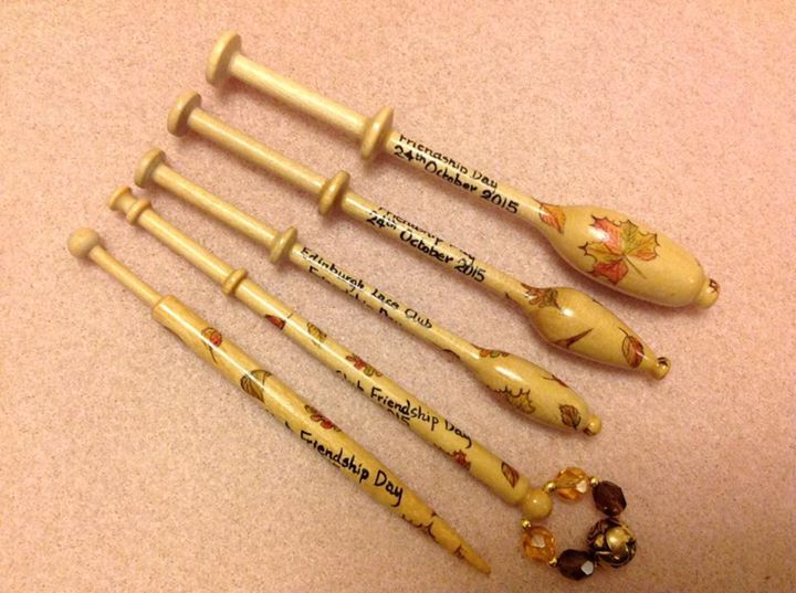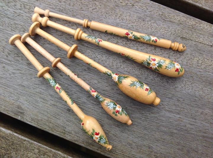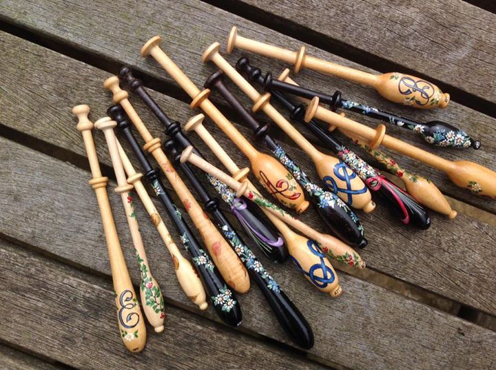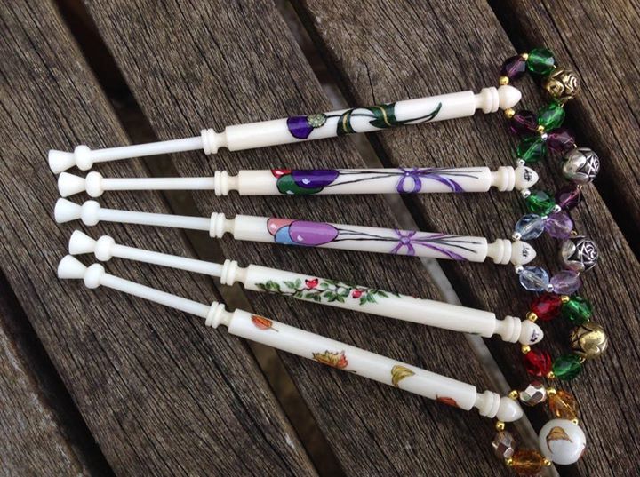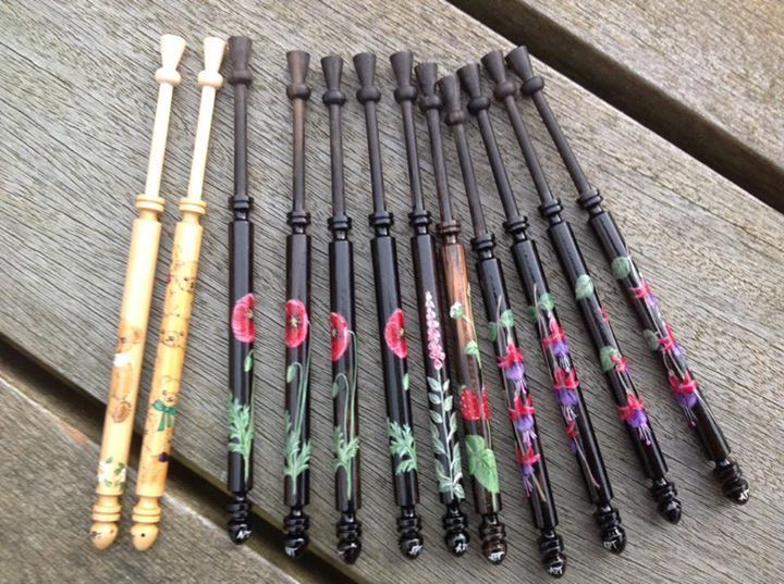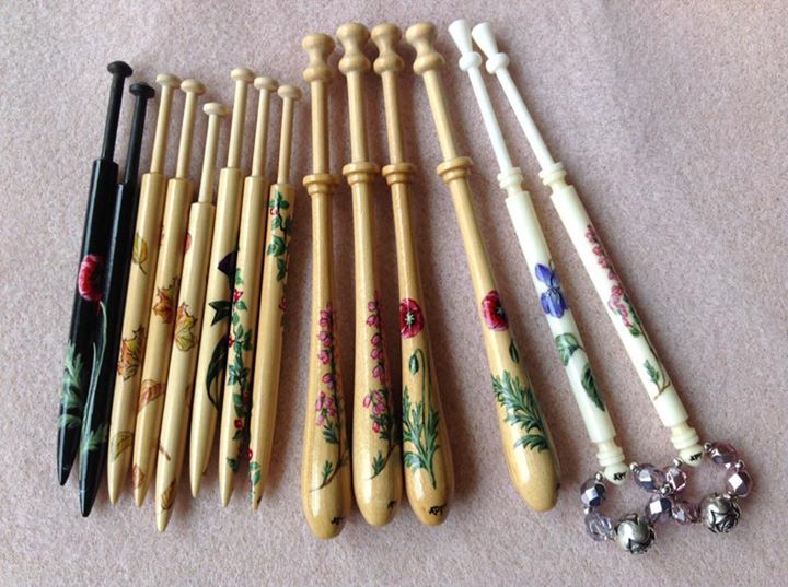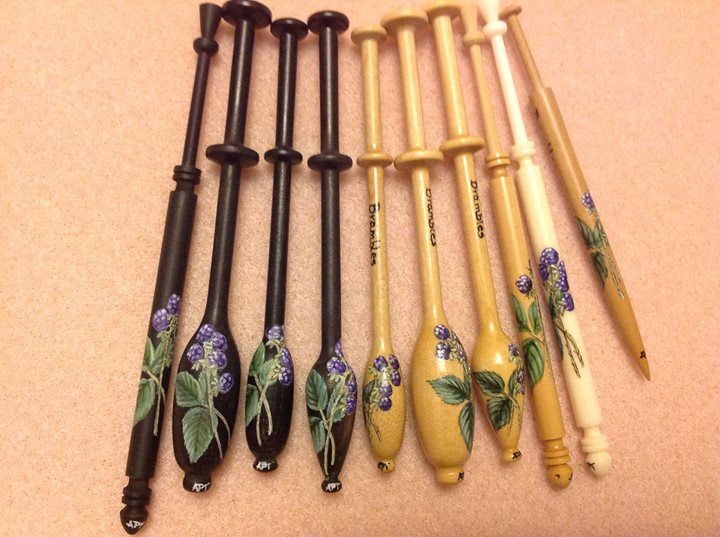 The Thumbnail Images show the type of bobbins and range of designs I paint, many of which are available from my Store. The designs work on most types of bobbins however some work better on larger bobbins e.g. the Celtic Knot on Bruge bobbins.