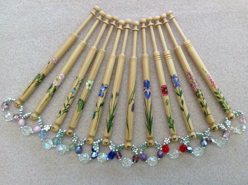 A choice of twelve named flowers painted on Lemonwood lace bobbin. Spangled to match with coordinating faceted glass and silver coloured spacer beads - colours may vary due to availability. A lovely gift for a lacemaker!